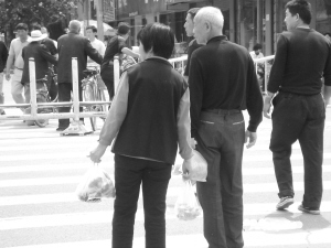 ?。翟拢保谷丈衔纾保啊茫常?,市區(qū)八一路與育新街交叉口,兩位老人購(gòu)物結(jié)束,手拎塑料袋,正在等候通過馬路。