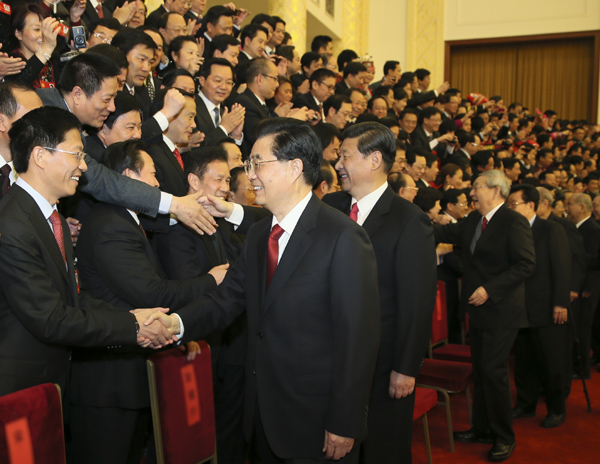 ????在熱烈的掌聲中,胡錦濤、習(xí)近平發(fā)表了重要講話?! ?/p>