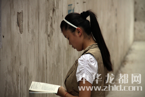 開考前一名女學生還在溫習課文。