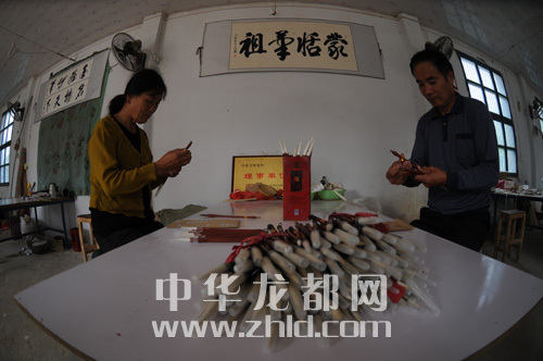????提起汝陽劉毛筆,劉四平滔滔不絕。“汝陽劉毛筆選料考究,兔毫的選擇標(biāo)準(zhǔn)是秋毫取健,取尖,春夏毫則不要;狼毫必須要到東北去采集過冬的黃鼠狼尾毛來制作?!闭勗掗g,劉四平順手拿起一支毛筆,說:“汝陽劉毛筆制作很精細(xì),主要工藝流程有:分毛-脫脂-去絨-裝毛-齊毛-墊毛-切毛-梳毛-修毛-成頭等128道工藝,成品具備尖、圓、齊、健‘四德’,軟硬適中的標(biāo)準(zhǔn);其外飾,尤其是筆桿的裝飾極為講究,根據(jù)筆的形狀和高、中、低檔的要求配之,既美觀又大方?!?/p>