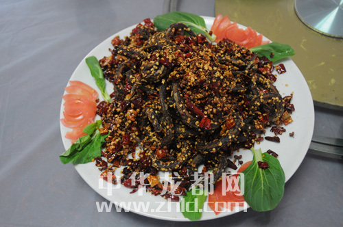 ????到了孫店鎮(zhèn),不吃“干煸盤龍鱔”是種遺憾。這里的“干煸盤龍鱔”不僅選料考究,而且做工精細(xì)。鱔魚必須選擇顏色呈黑褐色的天然生黃鱔,辣椒以紅色為宜。做法要經(jīng)過泡、燙、炸、煸炒等工序。“干煸盤龍鱔”具有極高的營養(yǎng)價(jià)值和藥膳作用?!袄倍荒?、麻而可口!”記者品嘗了剛做好的“干煸盤龍鱔”,發(fā)現(xiàn)風(fēng)味果真獨(dú)特。