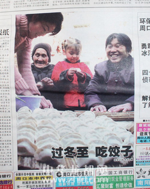 ????創(chuàng)刊號(hào)頭版壓軸圖片《過(guò)冬至,吃餃子》,拍攝的是80多歲的姥姥、50多歲的媽媽、30多歲的媳婦、五六歲的小女孩四世同堂歡天喜地包餃子的場(chǎng)景。媳婦搟餃子皮,姥姥、媽媽包餃子,五六歲的小女孩也來(lái)湊熱鬧,拿起一個(gè)餃子皮學(xué)著大人的模樣包餃子,剛剛包好的一大鍋蓋餃子令人垂涎。特別是按照晚報(bào)的送報(bào)時(shí)間,創(chuàng)刊號(hào)報(bào)紙送到千家萬(wàn)戶時(shí)正好是上午11時(shí)之前,此時(shí)正是人們包好餃子準(zhǔn)備煮餃子的時(shí)間??上攵?,大家一邊品讀屬于周口人自己的晚報(bào)、欣賞和諧家庭歡天喜地包餃子的圖片,一邊把包好的餃子下到沸騰的開(kāi)水鍋里,那煮出的餃子香味和著晚報(bào)濃濃的墨香,香飄滿城,沁人心脾。