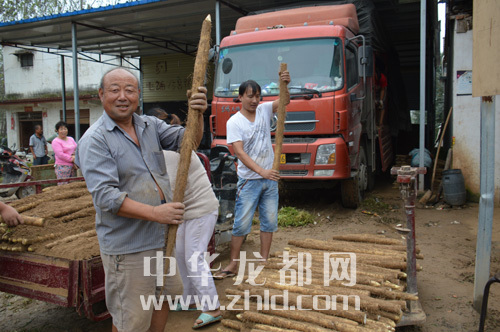 ??? 槐山藥經(jīng)紀(jì)人李勝利在自己的貨車上查看槐山藥裝車情況,據(jù)他介紹,他每年要向外地銷售近5000噸槐山藥。