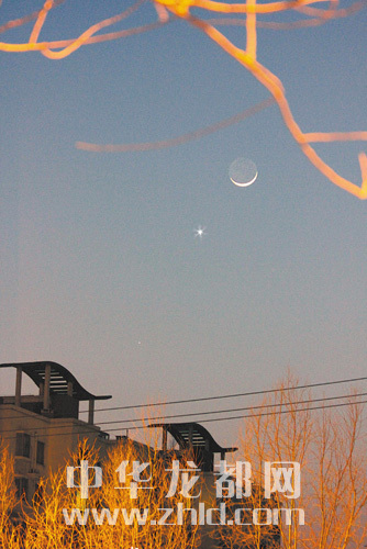 1月22日晚,“金星合月”在周口市區(qū)上演。彎月如同一艘銀色小船,明亮的金星在月亮左下方的天區(qū)跟隨著它。晚報(bào)記者 金月全 攝