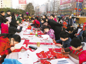 ????② 新春佳節(jié)即將來(lái)臨,三川大地處處洋溢著喜慶的氛圍。市區(qū)五一廣場(chǎng),一群愛好書法的小朋友正在為市民義務(wù)寫春聯(lián)。(記者 侯俊豫 攝)