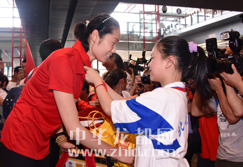 9月7日,一名學(xué)生在機(jī)場為載譽(yù)歸來的朱婷佩戴紅領(lǐng)巾。