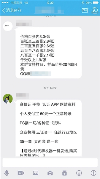 ????記者在前述QQ群里發(fā)現(xiàn),有賣家給出的“批發(fā)價(jià)格”是:100張內(nèi)3元一張;300張至500張為2.6元一張;500張至800張是2.3元一張;800張至1000張是2.1元一張;千張以上是1.9元一張。