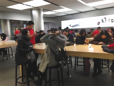 ????12月11日,蘋(píng)果王府井直營(yíng)店售后服務(wù)等待區(qū)。 實(shí)習(xí)生 孫亞慧 攝
