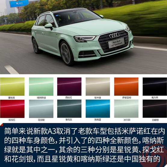 先來說說喀納斯綠到底是什么顏色吧。簡單來說新款A(yù)3取消了老款車型包括米薩諾紅在內(nèi)的四種車身顏色,并引入了的四種全新顏色,喀納斯綠就是其中之一,其余的三種分別是星銳黃、探戈紅和花劍銀,而且星銳黃和喀納斯綠還是兩種中國市場獨(dú)有的顏色。如果說這個顏色看上去像什么,我覺得大概像是哈密瓜冰激凌,或者是綠色的奶油,反正給我一種清新又甜蜜的錯覺。