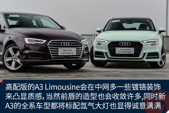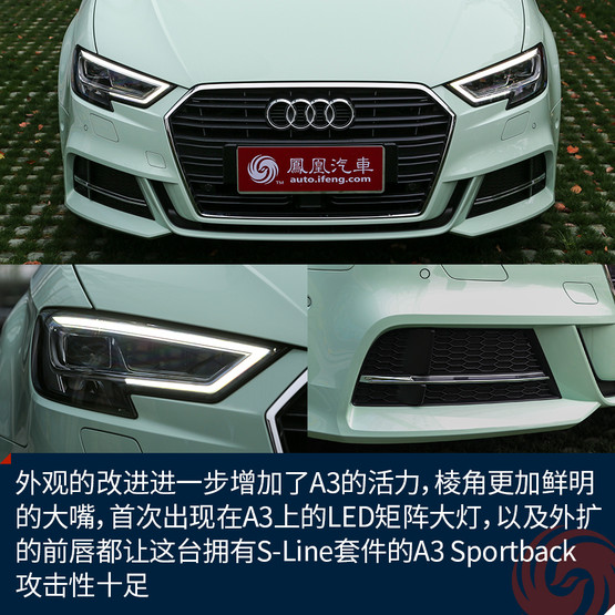 新顏色的加入讓原本青春靚麗的A3變得更加鮮嫩,雖說這樣的顏色不一定適合所有人,但是至少我是很喜歡的,應(yīng)該不少女生也會心生好感。而外觀的改進(jìn)進(jìn)一步增加了A3的活力,棱角更加鮮明的大嘴,首次出現(xiàn)在A3上的LED矩陣大燈,以及外擴(kuò)的前唇都讓這臺擁有S-Line套件的A3 Sportback攻擊性十足,同時全系都將標(biāo)配氙氣大燈也是誠意滿滿。而高配置的A3 Limousine會在中網(wǎng)多一些鍍鉻裝飾來凸顯質(zhì)感,當(dāng)然前唇的造型也會收斂許多。