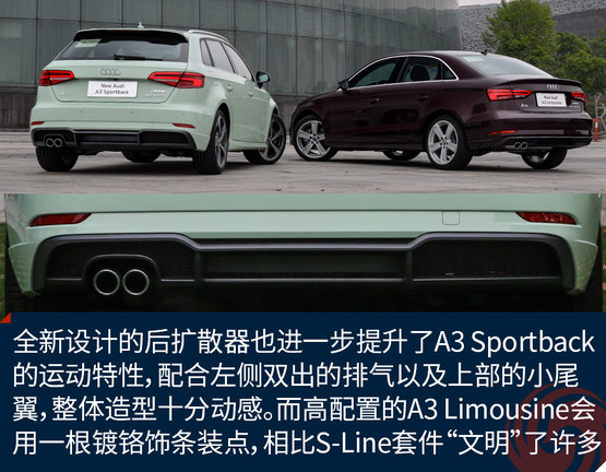 全新設(shè)計(jì)的后擴(kuò)散器也進(jìn)一步提升了A3 Sportback的運(yùn)動特性,配合左側(cè)雙出的排氣以及上部的小尾翼,整體造型十分動感。而高配置的A3 Limousine會用一根鍍鉻飾條裝點(diǎn),相比S-Line套件“文明”了許多。與LED矩陣大燈相呼應(yīng)的是全LED尾燈,兩者相輔相成為新車帶來了更強(qiáng)的攻擊性以及橫向視覺延展性,新加入的流動式轉(zhuǎn)向燈在美觀的同時也提升了整車的科技感。