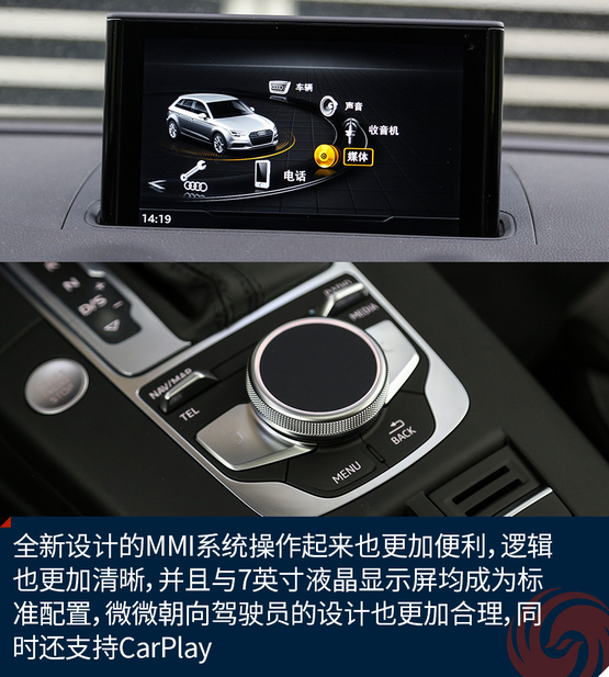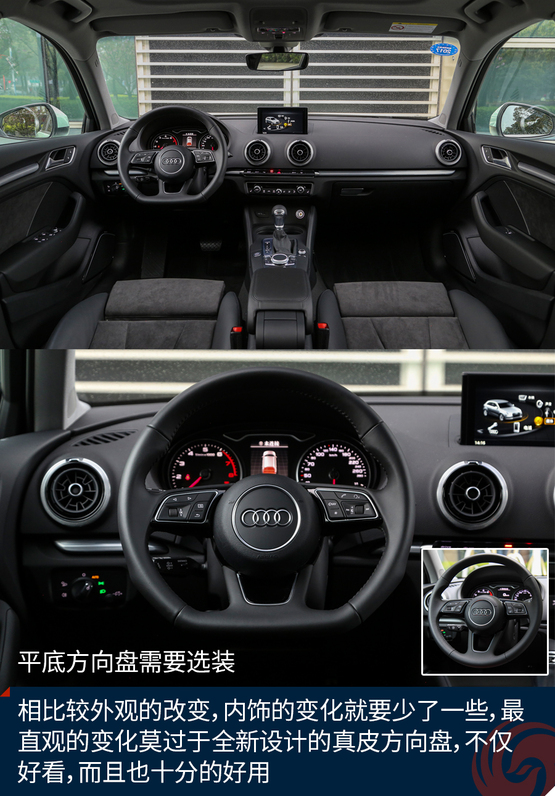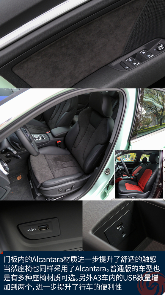 相比較外觀的改變,內(nèi)飾的變化就要少了一些,最直觀的變化莫過于全新設(shè)計(jì)的真皮方向盤,不僅好看也十分的好用,發(fā)光的迎賓踏板進(jìn)一步增加了車輛的高級感,中控面板上的鋁合金材質(zhì)的裝飾條質(zhì)感出色,不僅如此,還有多種樣式和材質(zhì)可選;而門板內(nèi)的Alcantara材質(zhì)進(jìn)一步提升了舒適的觸感,當(dāng)然座椅也同樣采用了Alcantara。另外新增加的USB接口也進(jìn)一步增加了行車的便利性,這也讓A3車內(nèi)的USB數(shù)量增加到兩個。同時,全新設(shè)計(jì)的MMI系統(tǒng)操作起來也更加便利,邏輯也更加清晰,并且與7英寸液晶顯示屏均成為標(biāo)準(zhǔn)配置,微微朝向駕駛員的設(shè)計(jì)也更加合理,同時還支持CarPlay。