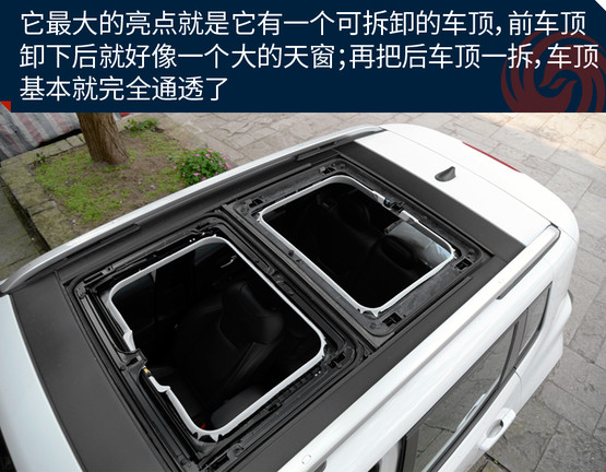 敞篷版車型將普通車型的天窗玻璃全部換成了可拆卸的頂棚,拆卸過程十分方便,即使是女性車主也能輕松拆卸。而且最重要的一點(diǎn)是這個頂棚不只是樣子貨,平時放在車頂時,車內(nèi)可進(jìn)行操作,把它變成一個電動天窗來用,是不是感覺特高端?