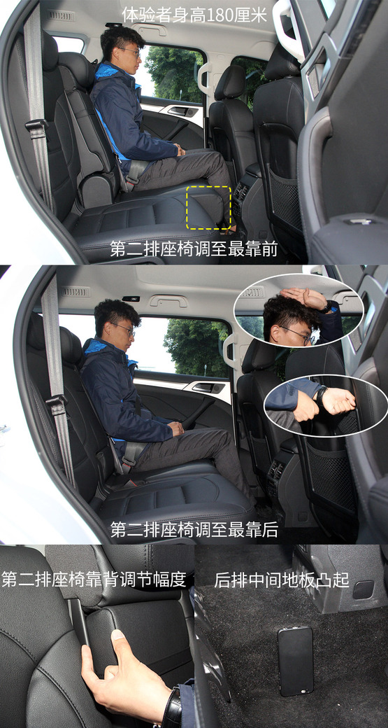關(guān)于第二排,最重要的當(dāng)然要數(shù)空間了。剛一坐到第二排之后,感覺確實(shí)是很寬敞,不僅腿部空間毫無壓力,頭部空間也完全沒有壓抑感,而且,第二排座椅還支持四向調(diào)節(jié),即座椅前后調(diào)節(jié)和靠背角度調(diào)節(jié),在第三排沒人乘坐的情況下,第二排乘客基本可以找到N種舒服姿勢(shì)來應(yīng)對(duì)長(zhǎng)途乘坐。只不過,第二排的中間地板凸起較高,一定程度上影響了中間乘客乘坐的舒適度。