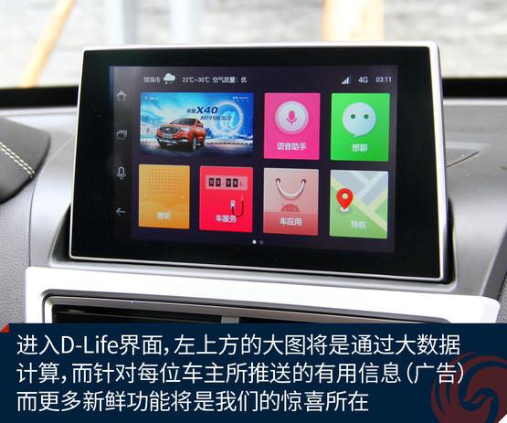 不過跟奔騰X40接觸兩天之后,會發(fā)現(xiàn)它大可不必在對手林立的市場中血拼顏值,靠實力不俗的獨門絕技一樣能夠輕松獲得一席之地。既然面向年輕用戶,豐富的車載娛樂系統(tǒng)很關(guān)鍵。大屏幕、手機互聯(lián)等等似乎已經(jīng)是這類車的標配。奔騰X40更進一步,所搭載的D-Life系統(tǒng)讓我們看到了它引領(lǐng)潮流的勁頭。