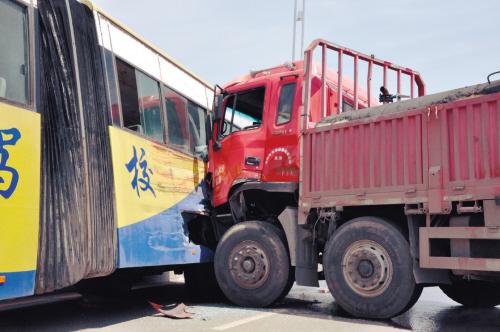 ????????記者觀察到,大客車(chē)側(cè)面寫(xiě)有“交通駕?!币恍写笞?,車(chē)頭朝西車(chē)尾朝東停著,右側(cè)車(chē)身被橋墩緊緊卡??;運(yùn)水罐車(chē)長(zhǎng)近20米,車(chē)身與大客車(chē)車(chē)身幾乎呈90度直角,運(yùn)水罐車(chē)車(chē)頭撞在大客車(chē)的左后側(cè),將大客車(chē)撞癟了。事發(fā)地點(diǎn)位于橋坡處,地面遍布七零八落的玻璃碎片,運(yùn)水罐車(chē)下面還有少量血跡。運(yùn)水罐車(chē)和大客車(chē)內(nèi)均空無(wú)一人。