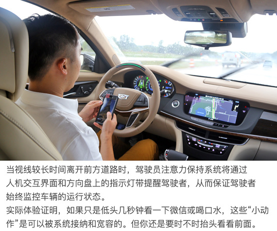 ????????原則上駕駛員應(yīng)該緊盯前方,時(shí)刻準(zhǔn)備著接管汽車的控制權(quán)。但實(shí)際上基于ACC自適應(yīng)巡航系統(tǒng)的Super Cruise?超級(jí)巡航為行駛中的汽車提供了充足的“安全緩沖余量”。在底特律郊區(qū)高速公路上實(shí)際體驗(yàn)證明,視線短暫的離開(kāi)正前方(大約3-5秒之內(nèi))處于系統(tǒng)安全的“可接受”范圍內(nèi),比如喝水、吃東西或者調(diào)節(jié)空調(diào)多媒體娛樂(lè)系統(tǒng),這些操作都沒(méi)什么問(wèn)題。