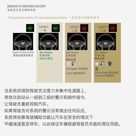 ????????若這個(gè)級(jí)別的警示還不能“喚醒”駕駛者,超級(jí)巡航系統(tǒng)將自動(dòng)開(kāi)啟雙閃、利用車輛輔助駕駛系統(tǒng)控制汽車逐漸減速并在路邊停車,然后OnStar安吉星工作人員將會(huì)通過(guò)遠(yuǎn)程對(duì)話介入以防止駕駛者因?yàn)椤笆堋痹斐筛嗖豢深A(yù)知的危險(xiǎn)。