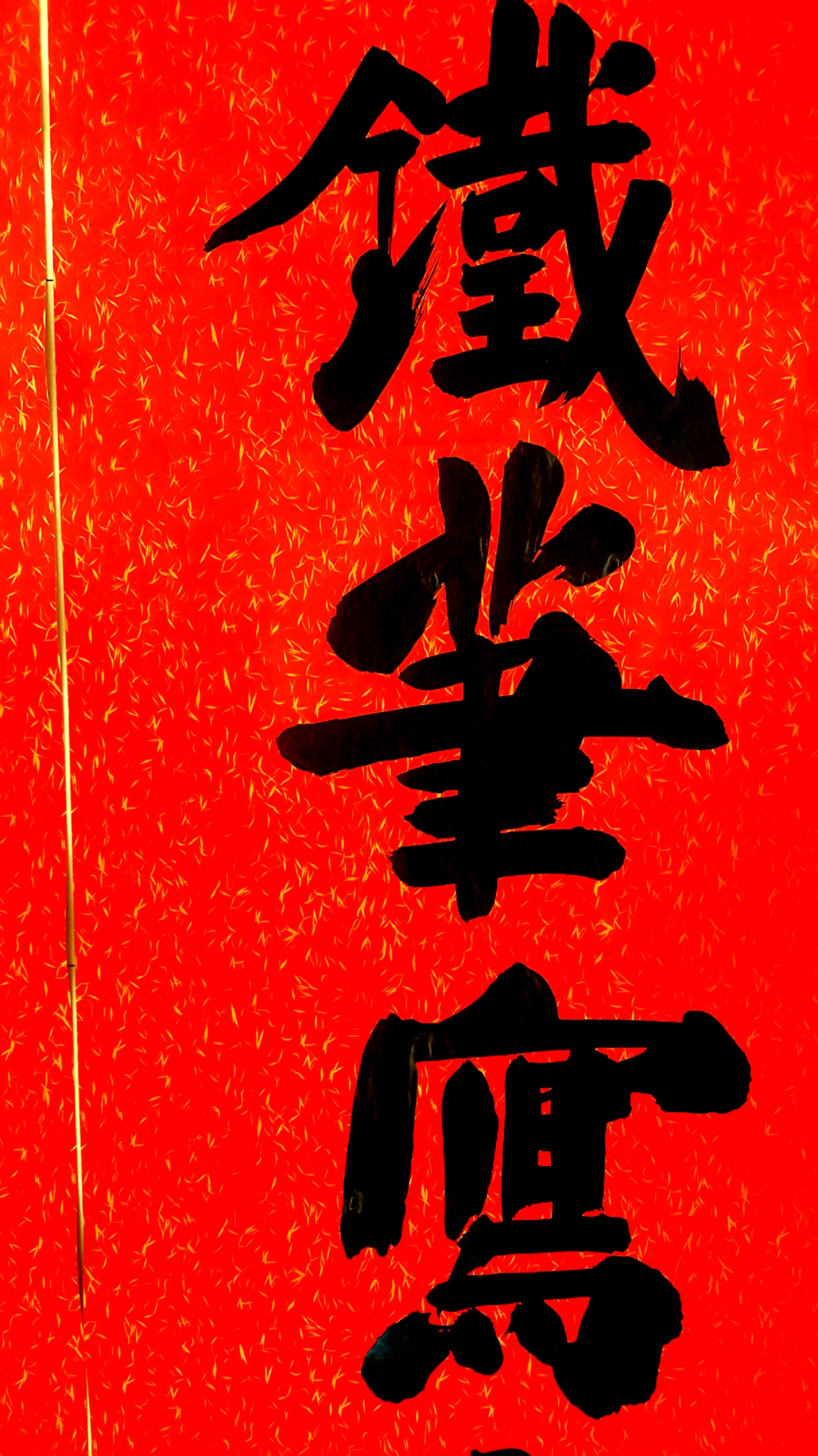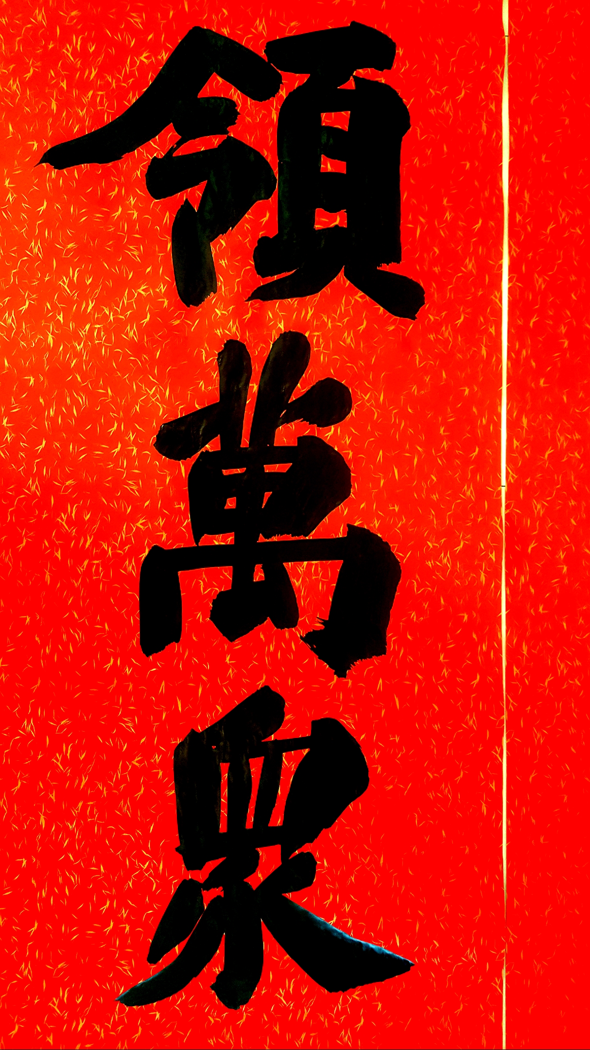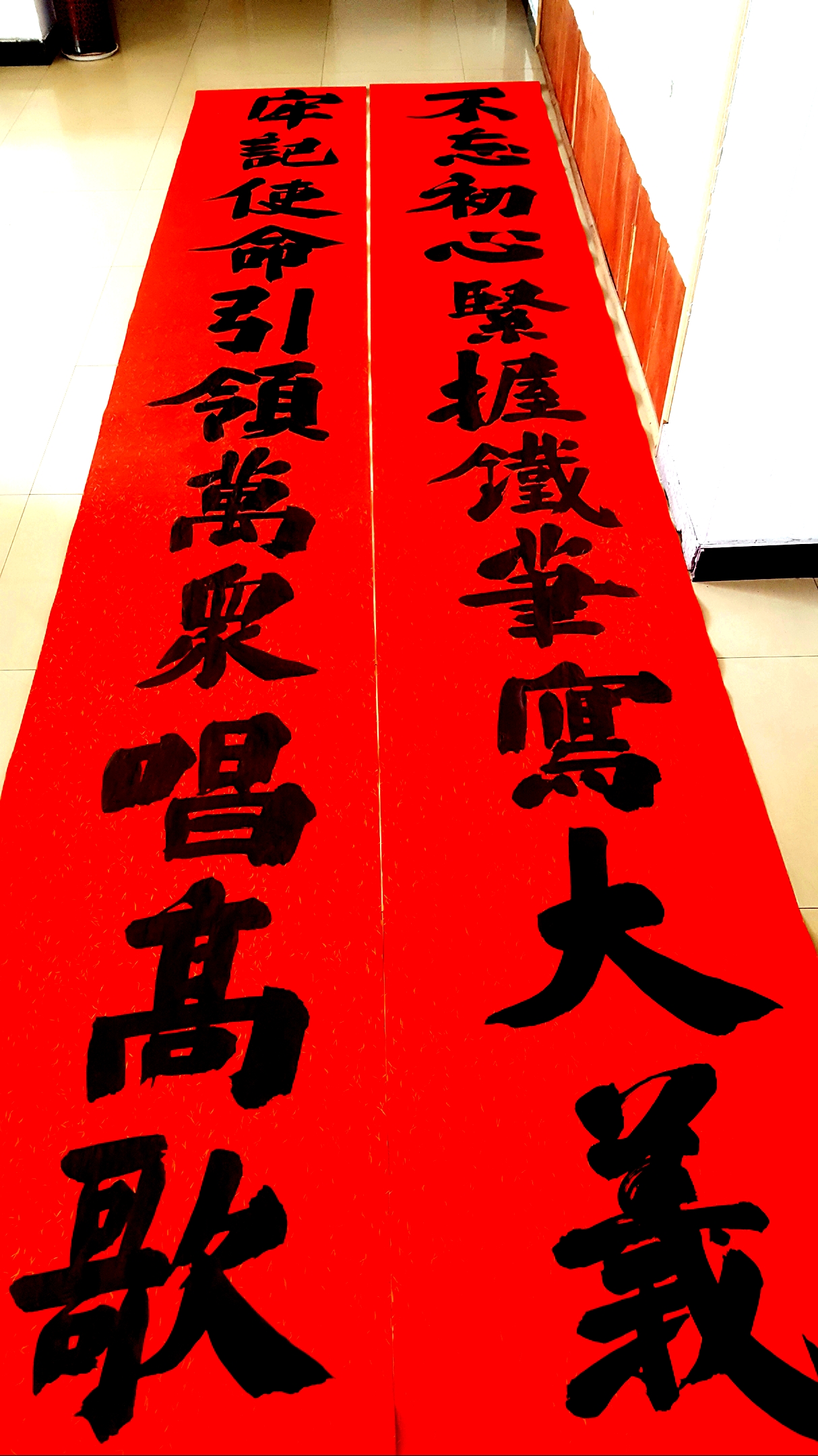 邢懷章以歐陽通筆法融合魏碑,大楷榜書創(chuàng)作而成,春聯(lián)長達5米,每字徑80公分左右,一氣呵成,不計工拙,近兩個小時完成兩幅巨型春聯(lián),表達了對周口報業(yè)集團的祝福,映出了喜慶的年味。