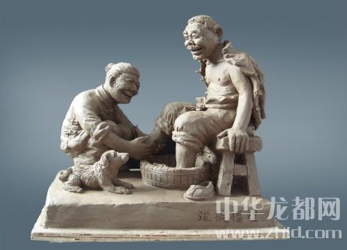 《老來伴》作品長50cm、寬35cm、高46cm。作品表現的是:老漢干了一天的農活兒回到家里,老婆用溫水給老漢洗洗腳,消除一天的疲勞,表達了老夫老妻恩恩愛愛、相濡以沫、白頭偕老。