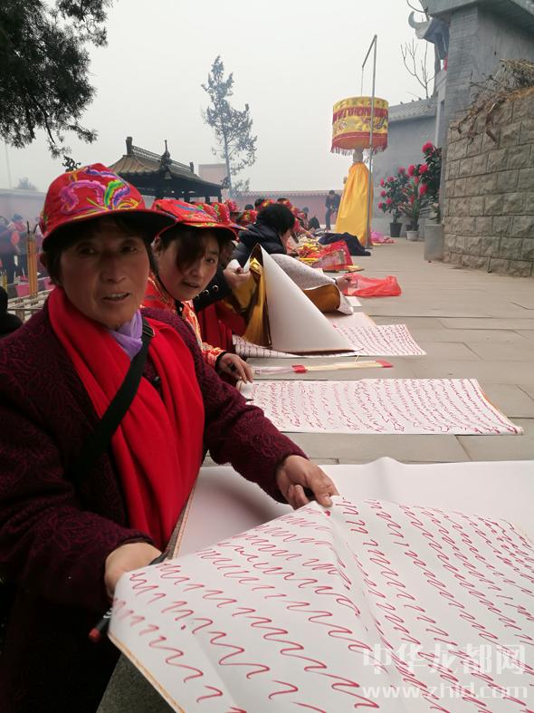 大霧的確延緩了香客的腳步,這也讓晚來的記者得以看到祭拜的盛景。女媧陵前,十幾名身著統(tǒng)一緞面紅襖,穿黑棉布鞋的女客正在結(jié)伴焚香祭拜,口音明顯和當(dāng)?shù)厝瞬煌?。她們是從距西華300多公里的濮陽范縣、臺前縣來的,說是凌晨2時就起身出發(fā),大霧中不僅遭遇堵車,還迷了路,到女媧城都快8時了。她們這次一起來的有30多人,分乘4輛車。就像往常前來一樣,她們在女媧城要焚香、跪拜、“寫賬”(在紙上畫符,敬奉女媧的一種民間形式)、“守功”(在大殿靜坐,以示對女媧親近),直至下午方回?!拔覀兠磕炅鲁跻缓团D月初一都來,為啥?信奉女媧娘娘唄,不來不舒服?!逼渲幸晃豢仔障憧透嬖V記者。