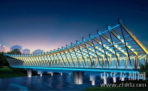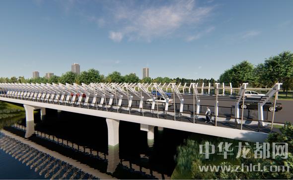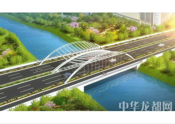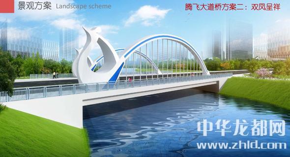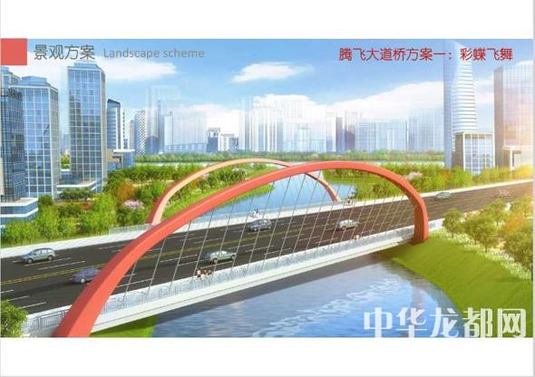 騰飛大道橋的設(shè)計(jì)方案有兩套,分別為“彩蝶飛舞”和“雙鳳呈祥”?!安实w舞”為下承式鋼管拱橋,寬36米。記者從效果圖中看到,橋兩側(cè)的拱圈,極具色彩感,給人一種賞心悅目的感覺?!半p鳳呈祥”為裝飾鋼管拱橋,寬36米。該橋采用“雙鳳”造型,象征天下太平,富含吉祥之意。