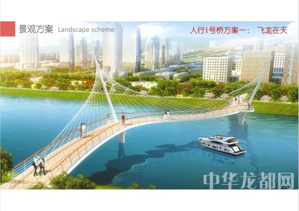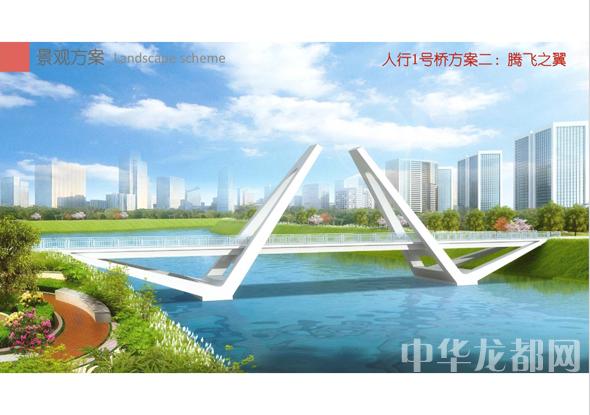 人行1號橋的設(shè)計(jì)方案有兩套,分別為“飛龍?jiān)谔臁焙汀膀v飛之翼”?!帮w龍?jiān)谔臁睘殡p塔斜拉橋。記者從效果圖中看到,該橋呈現(xiàn)出優(yōu)美的線條,宛如一條長龍騰空在天?!膀v飛之翼”為V腿連續(xù)鋼箱梁橋。記者從效果圖中看到,橋體簡潔流暢,時尚現(xiàn)代,橋墩形成穩(wěn)固的三角形,像兩只燕子展翅高飛。