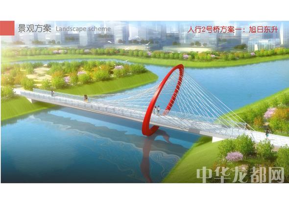 人行2號橋的設(shè)計(jì)方案有兩套,分別為“旭日東升”和“氣貫長虹”?!靶袢諙|升”為圓形塔懸索橋。記者從效果圖中看到,該橋的橋塔為圓形,猶如一輪東升的太陽,象征著城鄉(xiāng)一體化示范區(qū)蓬勃發(fā)展的未來?!皻庳為L虹”為中承式系桿拱橋。該方案結(jié)合中國玉帶橋的古典元素、抽象古典幾何美學(xué),采用現(xiàn)代的設(shè)計(jì)手法,創(chuàng)作出現(xiàn)代感和中國傳統(tǒng)橋梁元素雜糅的橋梁設(shè)計(jì)。