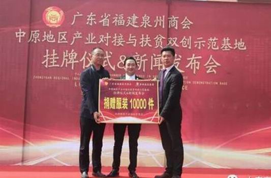 儀式上,廣東省福建泉州商會(huì)與香港磊磊集團(tuán)捐贈(zèng)服裝10000件,用于啟動(dòng)扶貧商店。與會(huì)領(lǐng)導(dǎo)共同為“廣東省福建泉州商會(huì)中原地區(qū)產(chǎn)業(yè)對(duì)接與扶貧雙創(chuàng)示范基地”揭牌。隨后,與會(huì)人員共同到潤(rùn)泰紡織、盛宏紡織、萬利源棉業(yè)等企業(yè)進(jìn)行了參觀,并召開了廣東省福建泉州商會(huì)中原地區(qū)產(chǎn)業(yè)對(duì)接與扶貧雙創(chuàng)示范基地產(chǎn)業(yè)對(duì)接論證座談會(huì)。