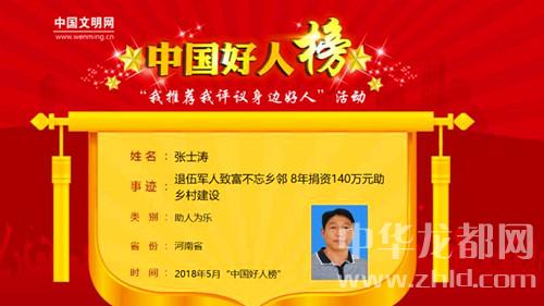 中華龍都網(wǎng)訊(周口報(bào)業(yè)全媒體記者 馬治衛(wèi))5月30日,中央文明辦、中國文明網(wǎng)正式發(fā)布了2018年“中國好人榜”5月榜單。我市太康籍張士濤榮登5月份“中國好人榜”。