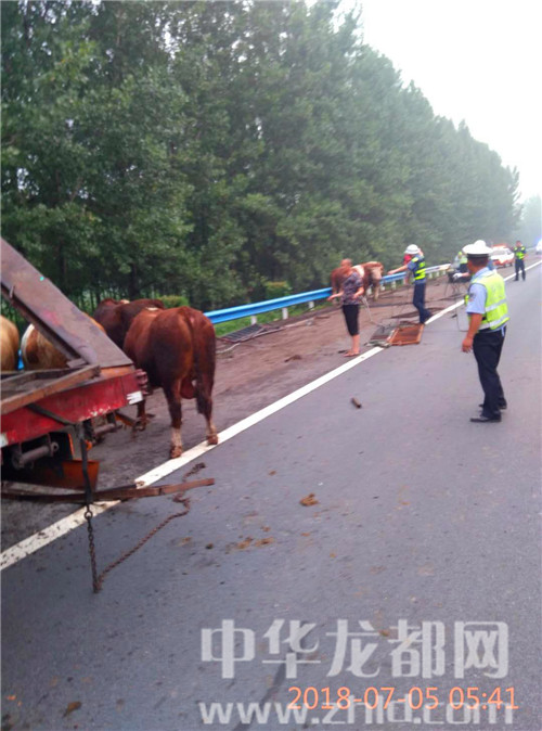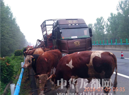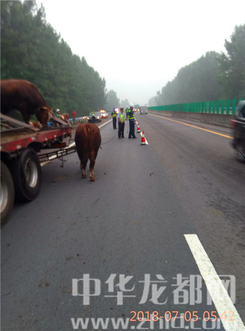 中華龍都網(wǎng)訊(周口報(bào)業(yè)全媒體記者 姬慧洋 通訊員 劉杰 文/圖)“在大廣高速2025公里西半幅附近發(fā)生一起單方事故,幾十頭牛散落在路面,請(qǐng)求處警?!?月5日5時(shí)許,周口市公安局交通管理支隊(duì)高速二大隊(duì)扶溝中隊(duì)接到110指令稱。