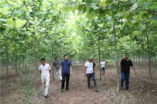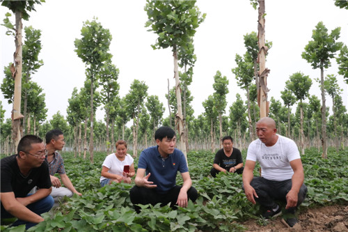 與前廟相鄰的大張村,是一個(gè)“天然大氧吧”。從大張村走出來的曹紅星在鄭州從事園林綠化多年,在朱口鎮(zhèn)黨委、鎮(zhèn)政府的支持和鼓勵(lì)下,他以1000元/畝的價(jià)格流轉(zhuǎn)了1000多畝土地,種植法桐、欒樹、國槐等綠化樹。有著豐富經(jīng)驗(yàn)的曹紅星在種植綠化樹的同時(shí),積極發(fā)展林下經(jīng)濟(jì),在綠化樹下種植紅薯、大蒜等,有效提高了土地的利用率,經(jīng)濟(jì)效益顯著提高?!捌綍r(shí),綠化林地除草、抗旱、施肥需要用工,收種紅薯、大蒜等也需要用工,用工時(shí)貧困戶優(yōu)先。只要有勞動(dòng)能力,來這里就能掙錢?!辈芗t星說,林業(yè)經(jīng)濟(jì)的快速發(fā)展為鄉(xiāng)親們脫貧致富提供了保障。