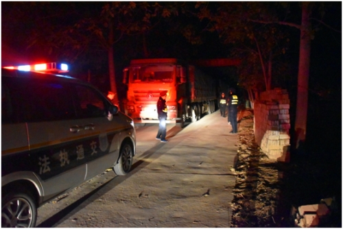 當(dāng)日22時40分,該所副所長楊春風(fēng)同志帶領(lǐng)兩個執(zhí)法中隊,對縣區(qū)域內(nèi)重點路段24小時不間斷巡查,在巡查到轉(zhuǎn)樓鄉(xiāng)通往龍曲鎮(zhèn)的X001線時,發(fā)現(xiàn)4輛大型超限車輛,其中3輛為“百噸王”,1輛為嚴(yán)重超載標(biāo)掛。司機(jī)為抗拒檢查,鎖閉車門遠(yuǎn)處觀望,我執(zhí)法人員堅守執(zhí)法現(xiàn)場,并及時調(diào)用拖車支援,另指派執(zhí)法人員與司機(jī)溝通,在動之以情、曉之以理的講解治超政策下,得到了司機(jī)的主動配合,把車輛暫扣至超限車輛卸載點。