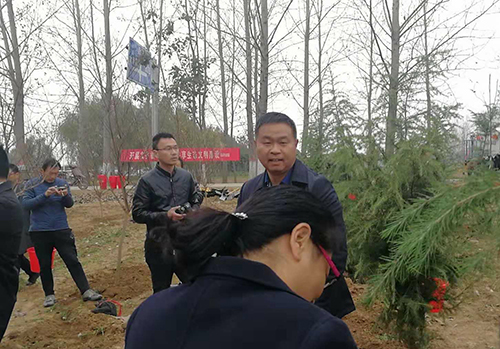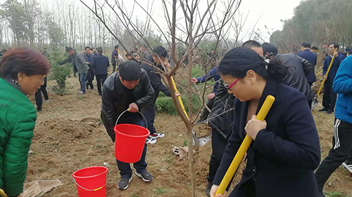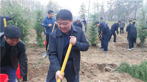 當天下午雖然暖陽照射,但初冬的鹿邑大地仍是涼風習習。不過這一點兒也沒有影響到大家的心情。一到植樹現(xiàn)場,梁建松、李剛等領(lǐng)導就和大家一起興致勃勃地拿起鐵鍬等工具忙碌起來,揮鍬鏟土,扶樹填土,澆水正苗,每道工序都做得認真細致、一絲不茍。