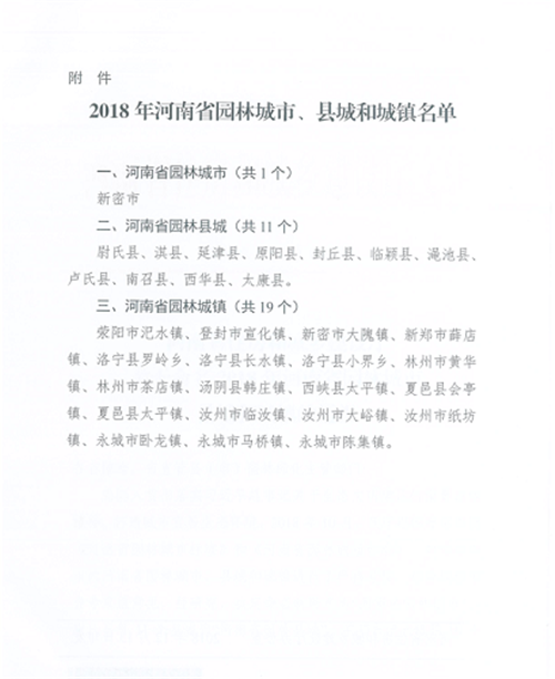 其中,新密市1地被命名為河南省園林城市,太康縣、西華縣、尉氏、淇縣、延津縣、原陽縣等11個(gè)縣被命名為河南省園林城市,登封市宜化鎮(zhèn)、新密市大隗鎮(zhèn)、新鄭市薛店鎮(zhèn)等19個(gè)鄉(xiāng)鎮(zhèn)被評為河南省園林城鎮(zhèn)。