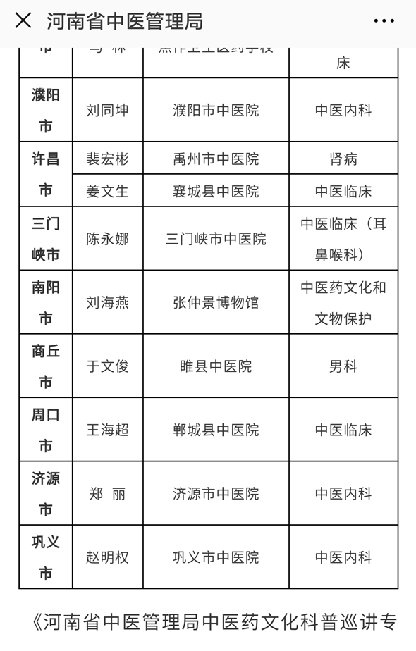 《通知顯示》,為加強全省中醫(yī)藥文化科普人才隊伍建設(shè),經(jīng)培訓(xùn)考核,張世卿、王海超等34位同志被遴選為第二批河南省中醫(yī)藥文化科普巡講專家,聘期三年。