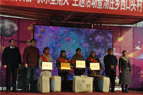 當(dāng)日,來(lái)自縣中醫(yī)院、縣衛(wèi)校附屬醫(yī)院的醫(yī)生在現(xiàn)場(chǎng)開(kāi)展義診活動(dòng),縣文聯(lián)開(kāi)展了春聯(lián)義寫(xiě)活動(dòng),縣科協(xié)、移動(dòng)公司等單位開(kāi)展了科技文化宣傳活動(dòng)。會(huì)議對(duì)湯莊鄉(xiāng)西口村評(píng)選出的“脫貧光榮戶、好婆婆、好媳婦、好鄉(xiāng)賢”等進(jìn)行表彰,縣委宣傳部副部長(zhǎng)李全力、縣科協(xié)主席陳玲、湯莊鄉(xiāng)鄉(xiāng)長(zhǎng)胡金旗等為獲獎(jiǎng)人員頒獎(jiǎng)。來(lái)自縣文化部門的文藝志愿者還為村民表演了精彩的文藝節(jié)目。