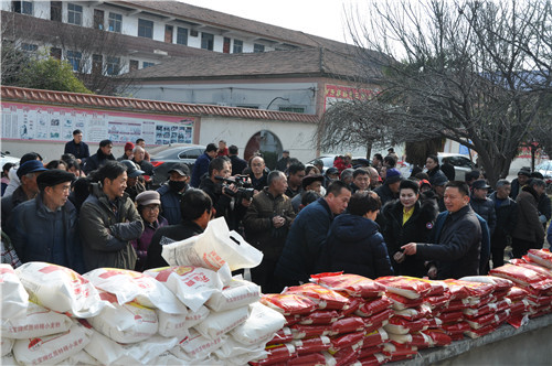 當日上午,愛心企業(yè)商水建業(yè)為500個家庭送來了米面油等過年物質,河南省越調劇團為農民帶來精彩的戲曲演出,剛剛參加全省“紅色文藝輕騎兵”慰問演出回到周口的申小梅女士為村民表演了群眾耳熟能詳?shù)摹妒战獋ァ愤x段。