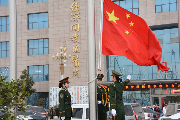 2月10日,正月初六,年后開工的好日子。在嚴格的“禁放令”下,周口城區(qū)沒有了“開門炮”的喧囂,卻有著更有意義的慶祝方式。圖為周口協(xié)和骨科醫(yī)院隆重舉行升國旗儀式,全面啟動節(jié)后工作,并祝愿祖國新年好運。 記者 李偉 攝