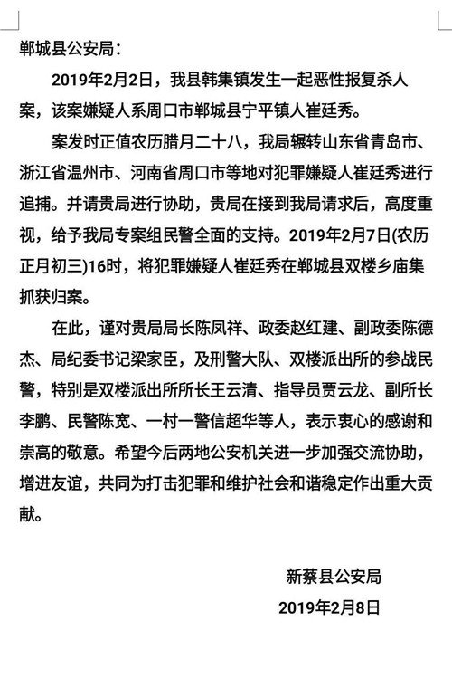 至此,駐馬店新蔡縣“2019.2.2”重大刑事案件全面告破。目前,嫌犯已由鄲城警方移交給新蔡警方做進(jìn)一步偵查辦理。