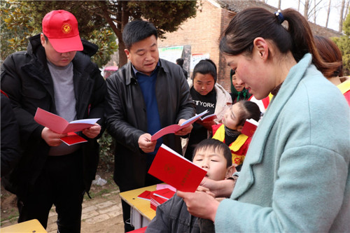 上午8時許,在新店鋪小學(xué)一棟教學(xué)樓前,前來參加活動的志愿者早已趕到,會場也已布置完畢。30多名身穿紅色馬甲的志愿者在會場中忙碌,排練節(jié)目、整理書包,向前去參加活動的村民和學(xué)生講解《志愿服務(wù)條例》和法律安全知識等。
