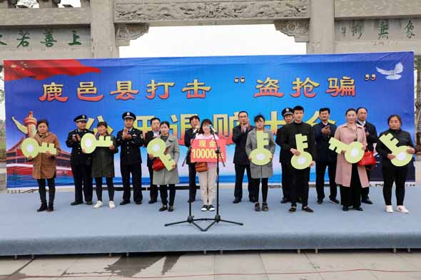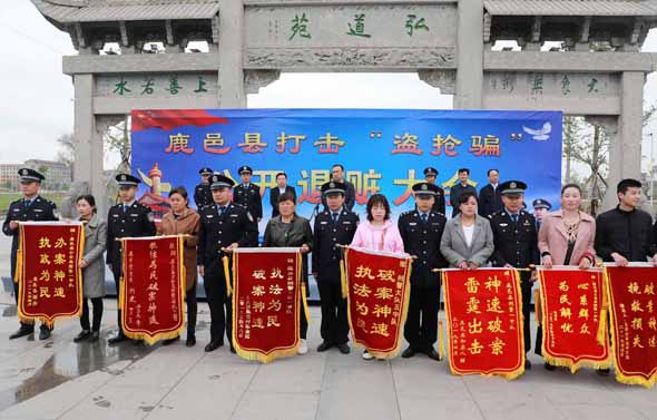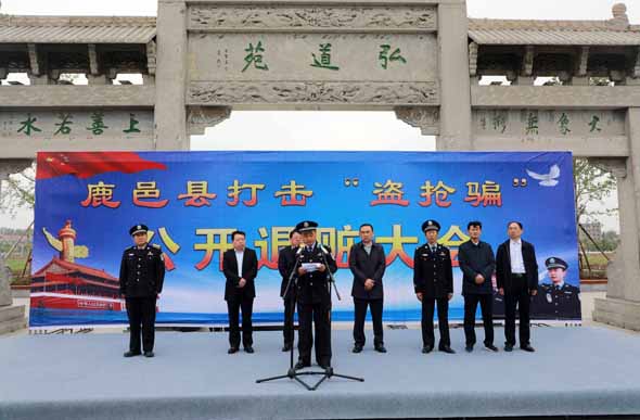 4月25日上午,鹿邑縣召開(kāi)打擊“盜搶騙”專(zhuān)項(xiàng)行動(dòng)公開(kāi)退贓大會(huì)??h委常委、政法委書(shū)記侯自峰出席會(huì)議并講話(huà)??h公、檢、法、司等有關(guān)部門(mén)負(fù)責(zé)人與群眾代表近300人參加退贓大會(huì)。