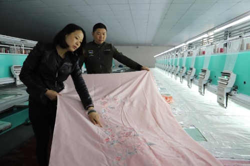 同時,城郊鄉(xiāng)發(fā)揮基層黨員干部和在外創(chuàng)業(yè)成功人士的廣泛人脈資源和經濟優(yōu)勢,引導社會投資發(fā)展產業(yè)助力脫貧攻堅。谷集行政村美紡科技有限公司就是典型個例。石永紅、石永華、石磊姐弟3人來自江蘇南通,他們盯上了城郊鄉(xiāng)的富余勞動力,投資800萬元建設了近2000平方米的紡繡車間,20臺國內先進設備可以利用全電腦操作繡出12種顏色的繡品。車間固定用工34人,其中建檔立卡貧困戶2人。只需要看著電腦控制臺、換布貼布、穿針引線,每人每天工資便可達到150元。