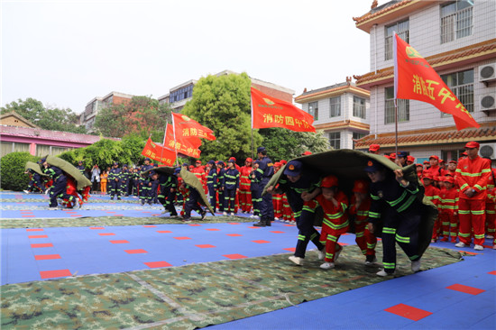 記者在現(xiàn)場(chǎng)看到,數(shù)十名老師分工明確,變身為“消防教官”;千名孩子隊(duì)列整齊,成為“小小消防員”;家長(zhǎng)則相伴左右,擔(dān)任“大大消防員”的角色。演練從“火災(zāi)”現(xiàn)場(chǎng)撤離拉開(kāi)序幕,消防健身體操、火場(chǎng)逃生、攀爬通過(guò)軟橋、打滾自救、滅火實(shí)驗(yàn),還有催人淚下的兒童防走失演練“小蝌蚪找媽媽”。“小蝌蚪找媽媽”活動(dòng)是讓孩子們無(wú)人引導(dǎo)的情況下,在所有家長(zhǎng)穿著相同、戴著帽子、戴著眼罩的茫茫人海中找爸爸媽媽。
