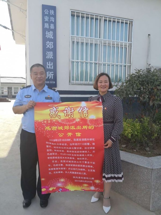 5月20日上午,扶溝縣實(shí)驗(yàn)幼兒園把一封感謝信送到城郊派出所民警手中,表達(dá)對(duì)該所民警迅速出警,快速辦案的敬意和謝意。