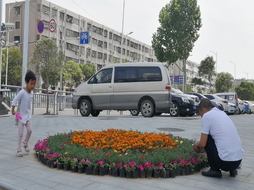6月3日,一位市民帶著孩子在中心城區(qū)八一大道與交通大道交叉口附近的花草前拍照、玩耍。近日,城區(qū)大街小巷擺上了五顏六色的花卉,把城市裝扮得更加靚麗。