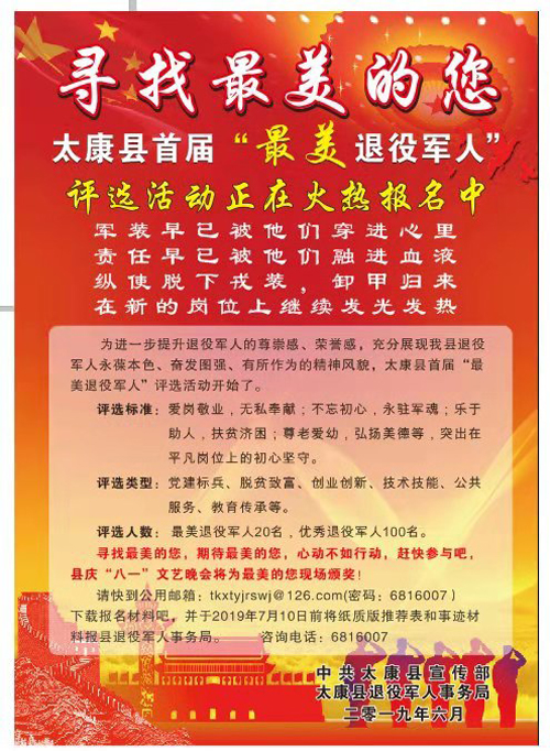 為進(jìn)一步提升退役軍人的尊崇感、榮譽(yù)感,充分展現(xiàn)全縣退役軍人永葆本色、奮發(fā)圖強(qiáng)、有所作為的精神風(fēng)貌,太康縣委宣傳部、太康縣退役軍人事務(wù)局從即日起聯(lián)合開展首屆“最美退役軍人”評(píng)選活動(dòng),對(duì)全縣退役軍人中涌現(xiàn)出來的黨建標(biāo)兵、脫貧致富、創(chuàng)業(yè)創(chuàng)新、技術(shù)技能、公共服務(wù)、教育傳承等方面典型代表進(jìn)行評(píng)選表彰。