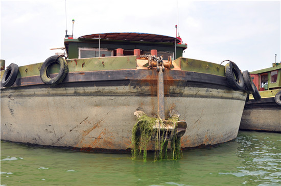 8月8日上午,在碧波蕩漾的商水港區(qū),6條載重上千噸的大船緊靠在一起,一船金燦燦的玉米,兩船褐色的石子,三船白色晶體方解石。站在港口上方遠遠望去,6條貨船像一塊彩條布鑲嵌在綠色的河面上。
