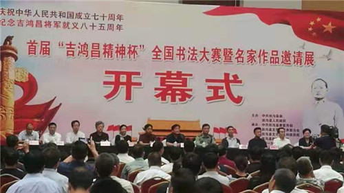 為紀念抗日民族英雄吉鴻昌將軍就義85周年,大力弘揚愛國主義精神和中華民族優(yōu)秀傳統(tǒng)文化,9月28日上午,首屆“吉鴻昌精神杯”全國書法大賽暨名家作品邀請展在扶溝縣體育館隆重舉行。原廣州軍區(qū)政治部副主任陳大民少將、解放軍報社原副社長田仁德少將、解放軍報社原副總編孫臨平少將、解放軍裝備學院原副政委孫南京少將、解放軍總后勤部某研究所原所長楊廷欣少將、吉鴻昌將軍親屬鄭吉安大校,市委常委、周口軍分區(qū)政委孫先振,市政協(xié)副主席張文平,扶溝縣四個班子領導及副處級干部等出席開幕式。縣委副書記、政法委書記詹凱主持儀式。
