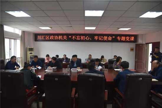 川匯區(qū)政協(xié)黨組副書記、副主席梁顯棟,副主席王建國、黃婉真、馬淮海及機關黨員干部聆聽黨課。
